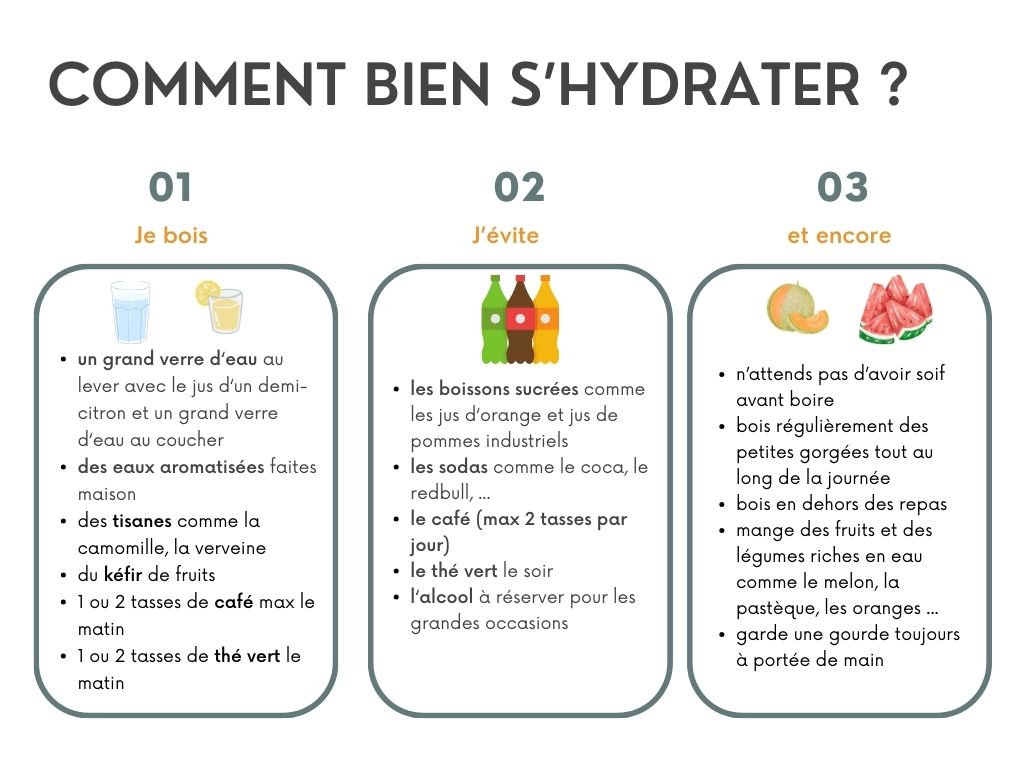 Une bonne hydratation est essentielle pour maintenir des fonctions cérébrales optimales. Tu as besoin de 2,5 litre/jour = 1,5 litre par les boissons et 1 litre par l’alimentation. Si tu fais beaucoup du sport, augmente la quantité en fonction de ton activité.