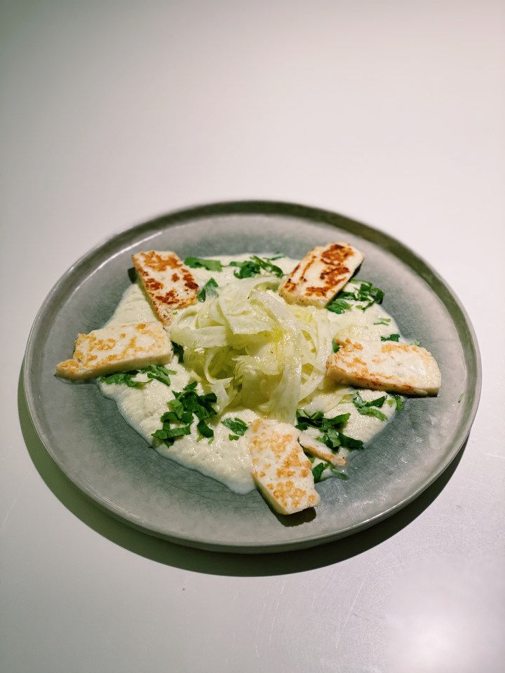 4/ dressez les assiettes en déposant la mousse de chou-rave au fond de l’assiette, déposez l’halloumi, déposez le fenouil et ciselez la coriandre.