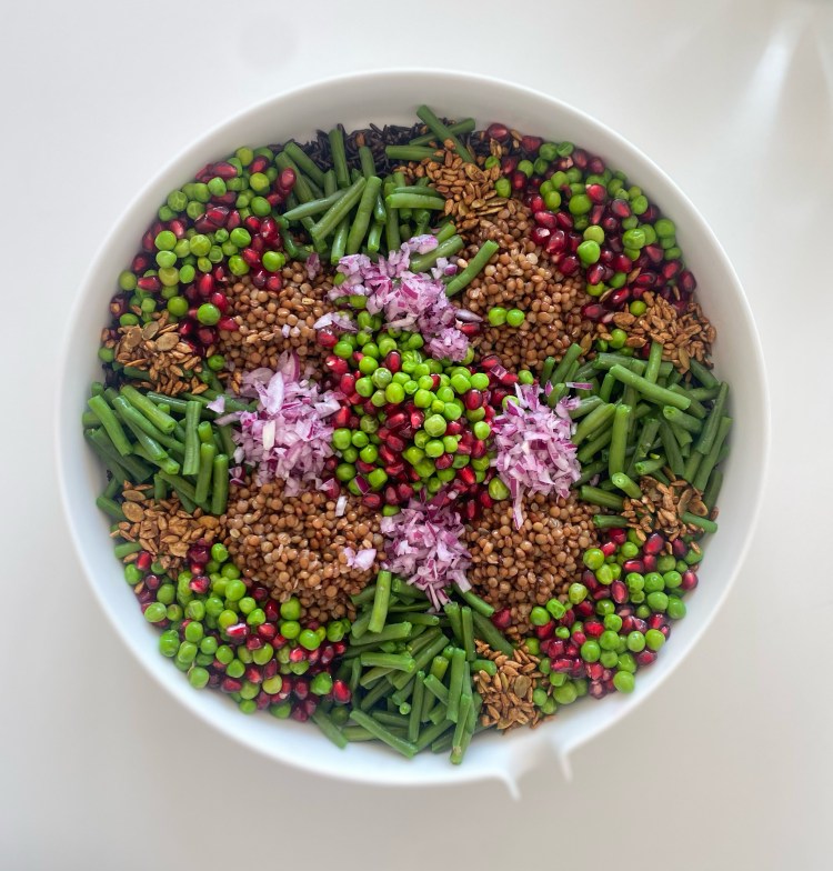 8/ Composez votre plat avec tous les ingrédients en ajoutant les graines de courge & de tournesol et les herbes aromatiques ciselées et assaisonnez.