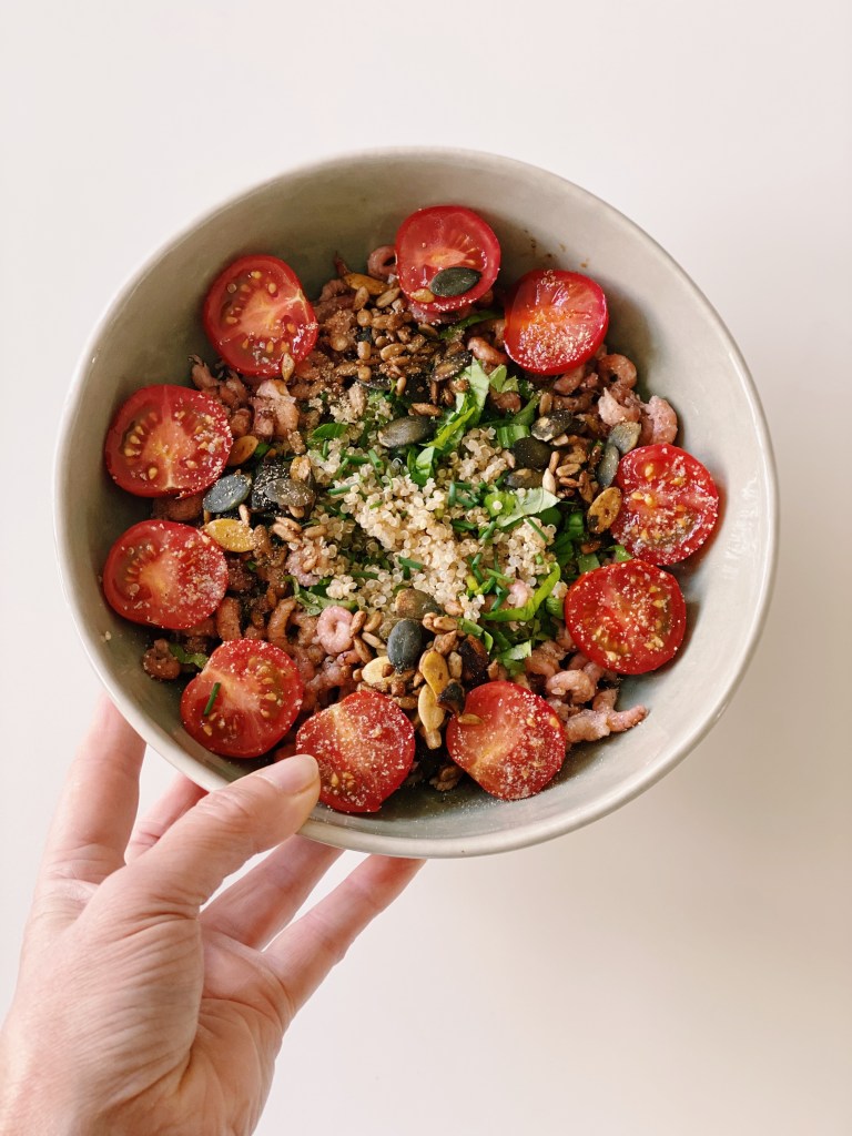 5/ Ajoutez le basilic et la ciboulette ciselées et les graines de tournesol et de courge au tamari