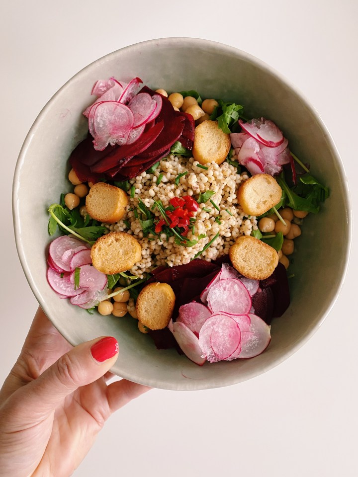 6/ Coupez à la mandoline la betterave et les radis et disposez-les dans l’assiette